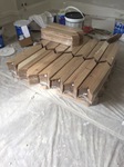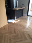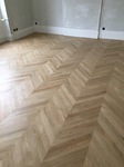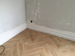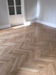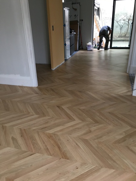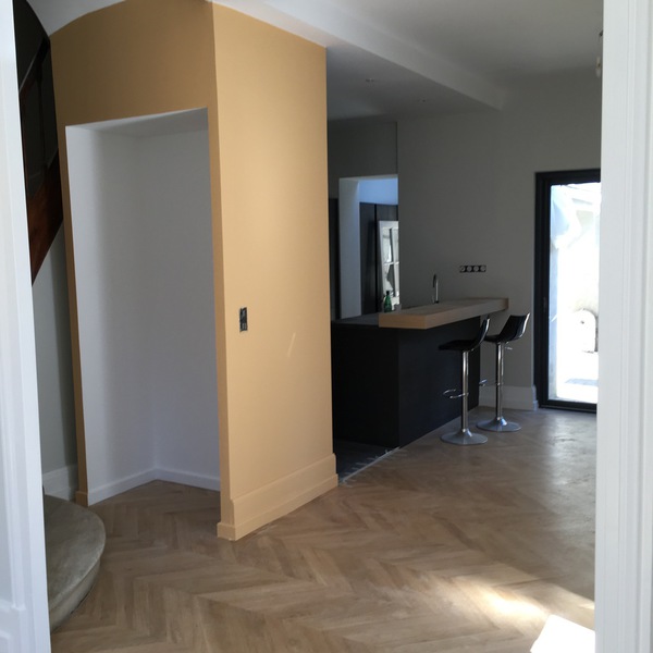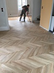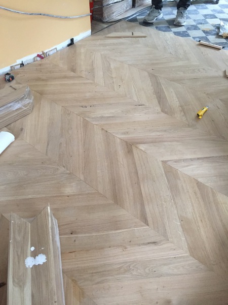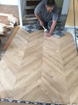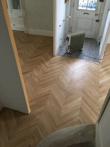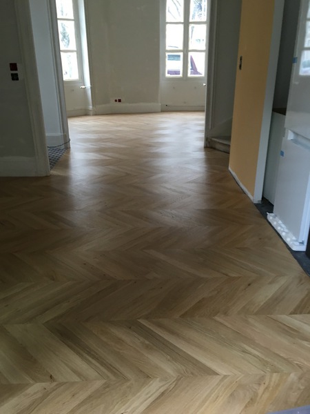 Parquet en chêne massif collé sur carrelage existant, pose en points de Hongrie.